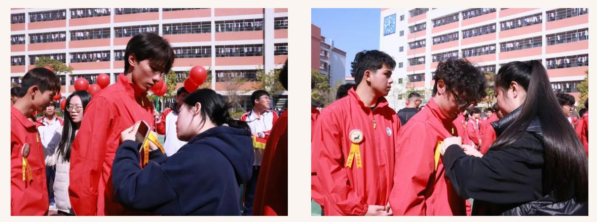 随后,老师们将象征荣耀与信念的必胜胸章,佩戴在每一位考生胸前。小小的胸章承载着沉甸甸的期望,是师长们的祝福,更是前行的力量。学子们挺直胸膛,眼神坚定,此刻的荣耀与责任在心中激荡。