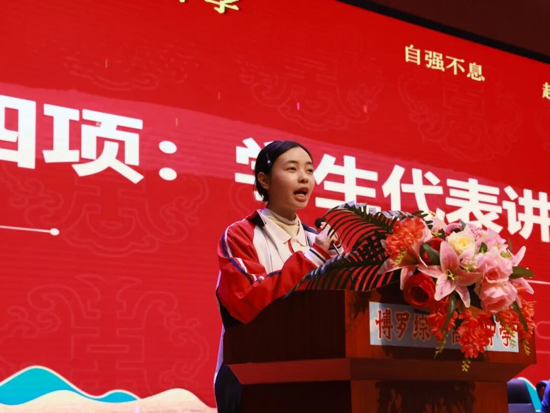 高三(5)班郭晓蓓同学作为学生代表发言,她真诚分享了自己从“荒废期”到“奋起直追”的蜕变历程。“觉醒”与“坚持”是她实现跨越的关键。她勉励全体同学:“起点不决定终点,只要决心改变并付诸行动,每个人都能书写自己的逆袭篇章。”她的讲述真挚动人,展现了青春不服输、敢拼搏的昂扬姿态。